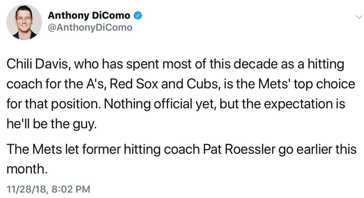 If the hiring goes through, I like this move for the Mets and I can see Chili being a good buzz in Callaway’s ear as a buffer between the players and manager. Davis has gotten nothing but praises in his former positions and may be destined to be a Manager in the near future.