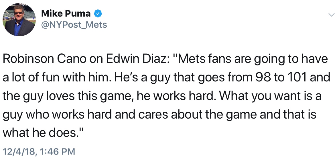 Mike Puma tweeted this quote by Cano on Diaz and his work ethic. High praises by the new Mets second baseman and Diaz is looking like a better acquisition each time something comes out about him.