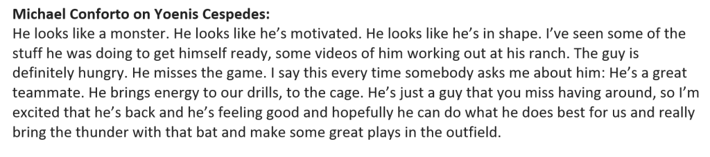 “He looks like a monster. He looks like he’s motivated. He looks like he’s in shape… The guy is definitely hungry.” – Michael Conforto