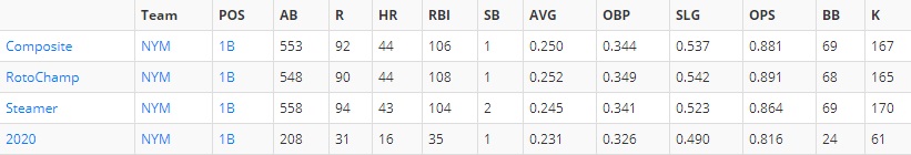 Rotochamp has Pete Alonso with 44 home runs and 108 batted in on the year with a .252 batting average and an .349 OBP Here’s their projections.