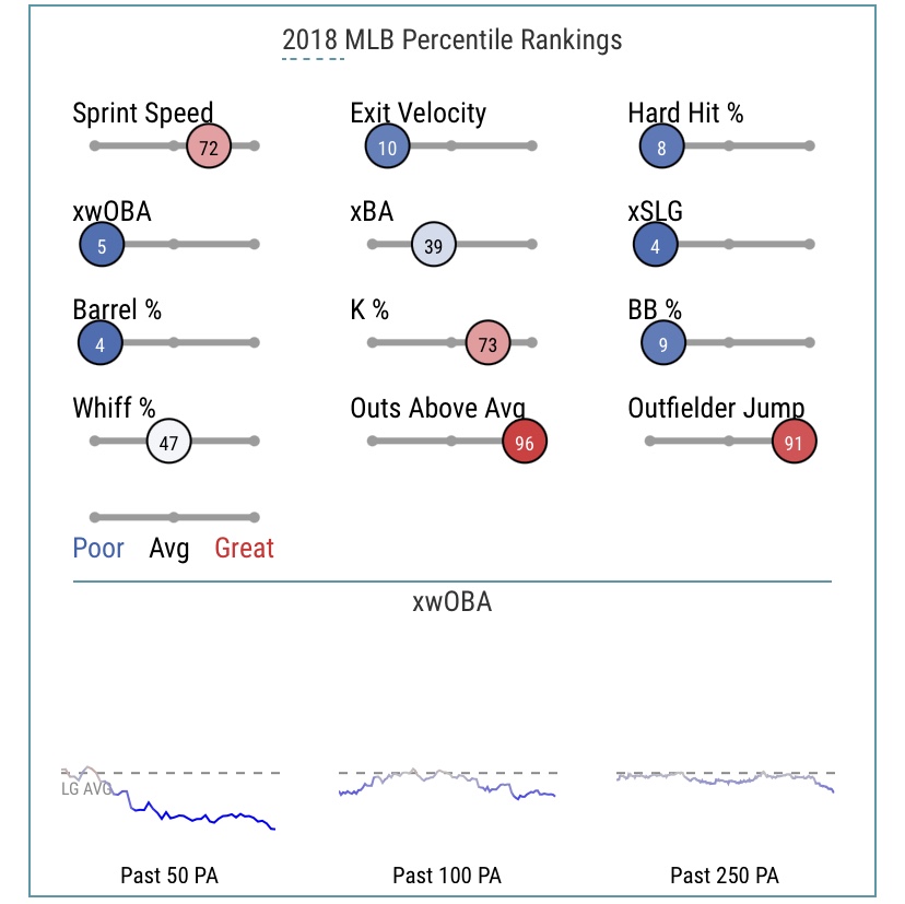 In 2018, his sprint speed wasn’t as good but his outfielder jump still had him in the 91st percentile and his OAA in the astonishing 96th percentile. That season he also 24 doubles, one triple, five home runs and 41 RBI’s with a .286/.323/.378/.701 slash line.