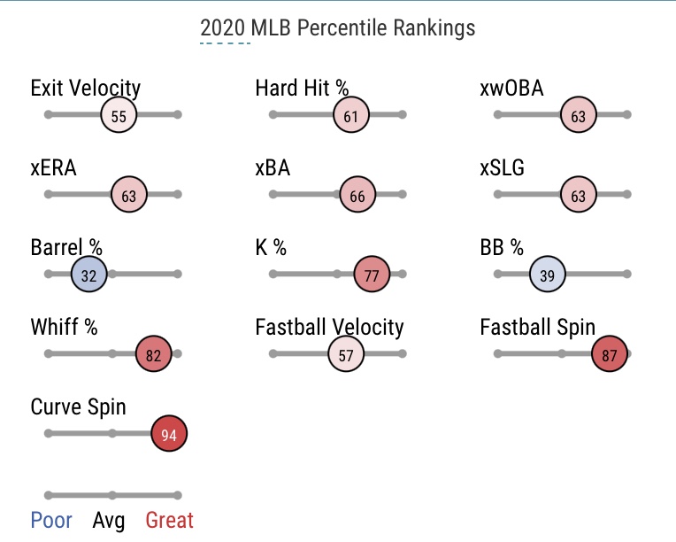 His fastball is a tick above the league average in pertains to velocity, however his movement on it towards the top of his class. When it comes to his curveball, he ranked in the 94th percentile during the 2020 campaign and has added approximately 6 inches to the drop in that pitch between 2017 and 2018.