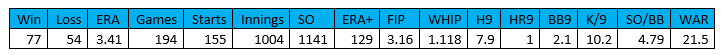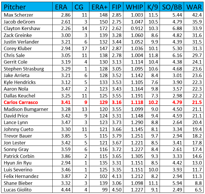 Since 2014, a total of 72 different starting pitchers have gotten at least one vote for the Cy Young award. Of these, only 27 have gotten votes in more than one season. It is fair to say that these are the 27 pitchers we can reasonably call the top starters of the game as they have had multiple great seasons. So where does Carrasco stand against these pitchers. The answer is… right in the middle: