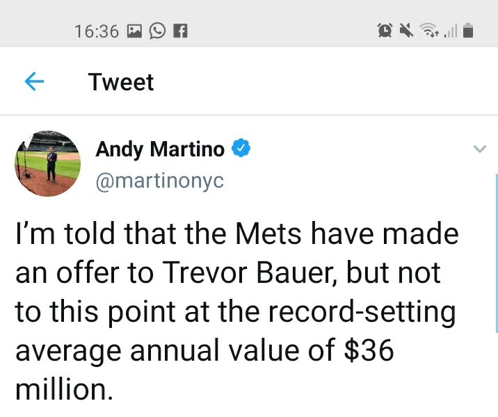According to Bob Nightengale the Mets have formally made an offer to Trevor Bauer. The offer would mean Bauer will have the highest AAV of any player in the league. Highest AAV right now is Mike Trout. The Mets have “logically” emerged as the clear front runner to get the 2020 NL CY Young award winner.