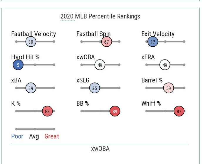 His main issue with the fastball is the launch angle against (21 degrees). His cutter also got hit hard, but it did provide solid whiff rate (41.5%)
