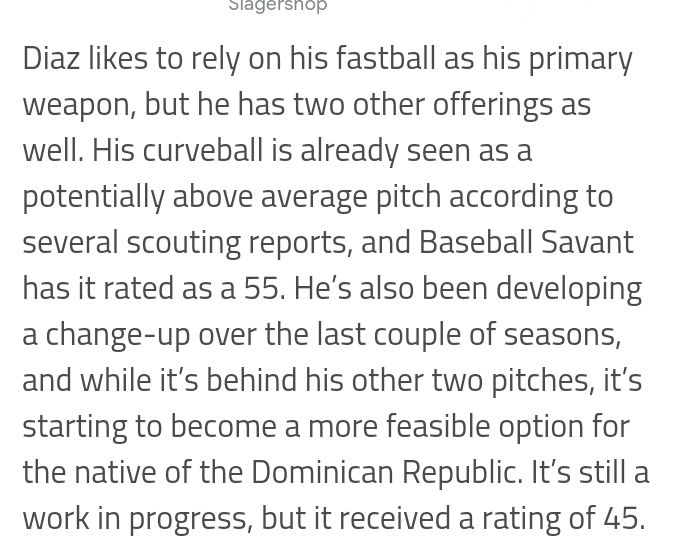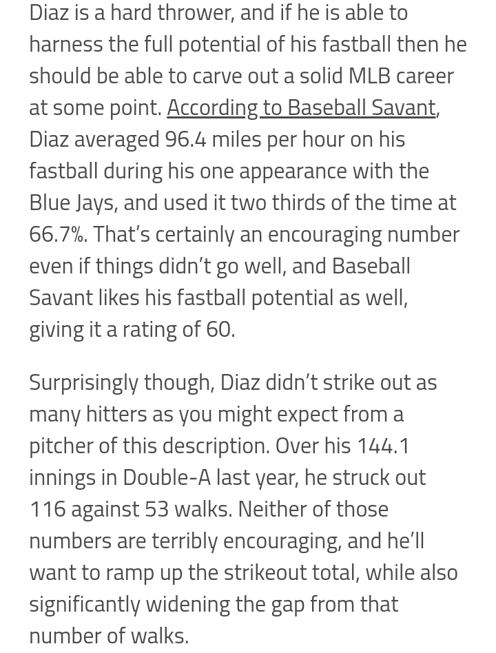 Diaz has been pitching well at Syracuse. Over 4 innings of work, Diaz allowed just 3 hits, no walks, while striking out 4. Over his minor league career Diaz owns a 3.82 ERA.